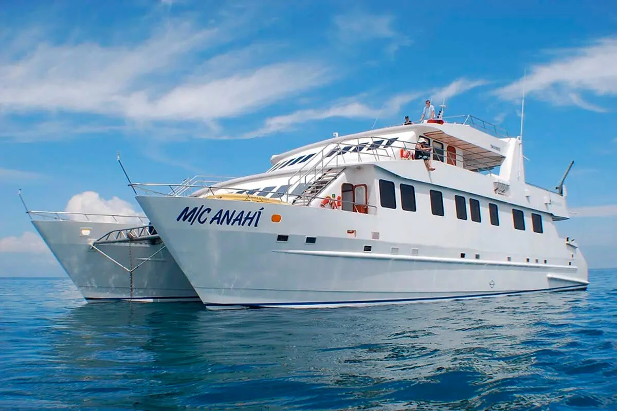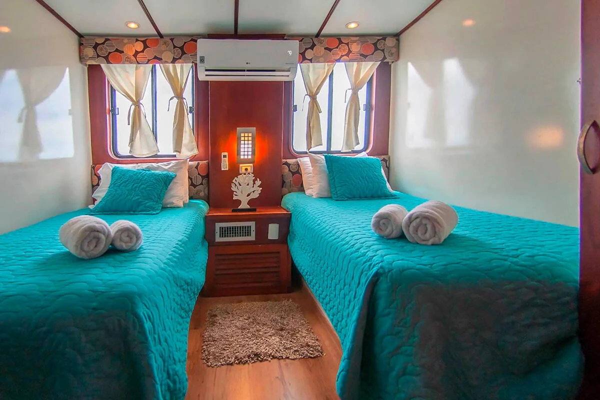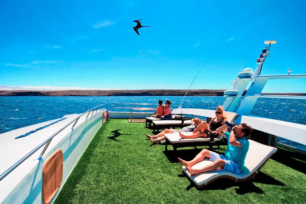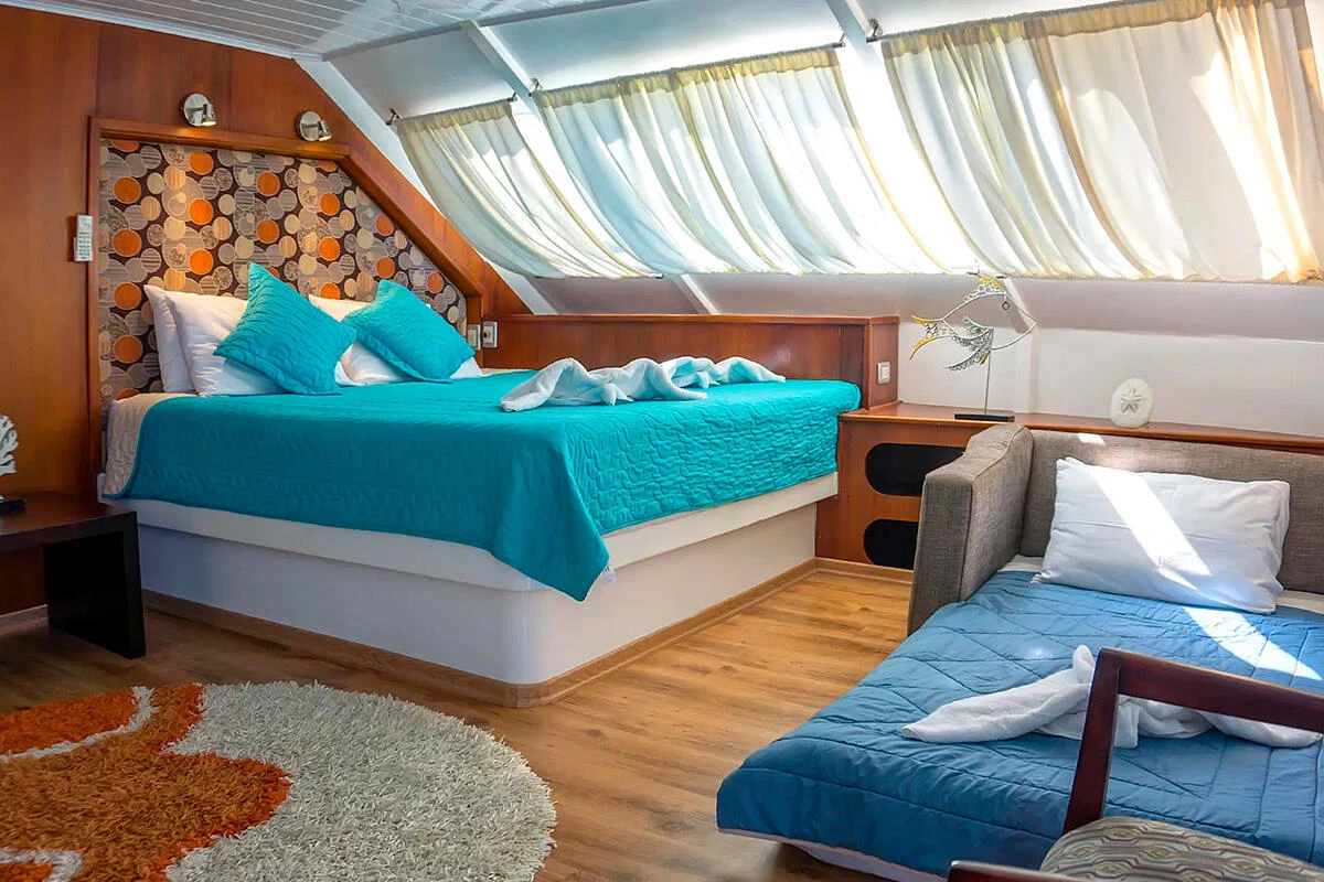 The Anahí catamaran stands out for its elegance, stability, and luxury service. It accommodates 16 passengers in 8 cabins (6 standard and 2 suites), all with private bathrooms and air conditioning. Its itineraries visit remote and exclusive islands, and onboard guests enjoy spacious lounges, a jacuzzi, and a refined atmosphere. Perfect for travelers seeking comfort and a premium Galápagos experience.